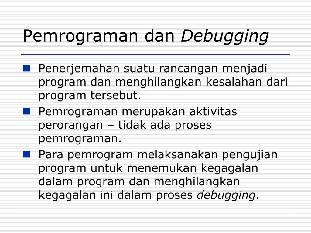 Pemrograman dan Debugging • Penerjemahan suatu rancangan menjadi program dan menghilangkan kesalahan dari program tersebut. • Pemrograman merupakan aktivitas perorangan – tidak ada proses pemrograman. • Para pemrogram melaksanakan pengujian program untuk menemukan kegagalan dalam program dan menghilangkan kegagalan ini dalam proses debugging.