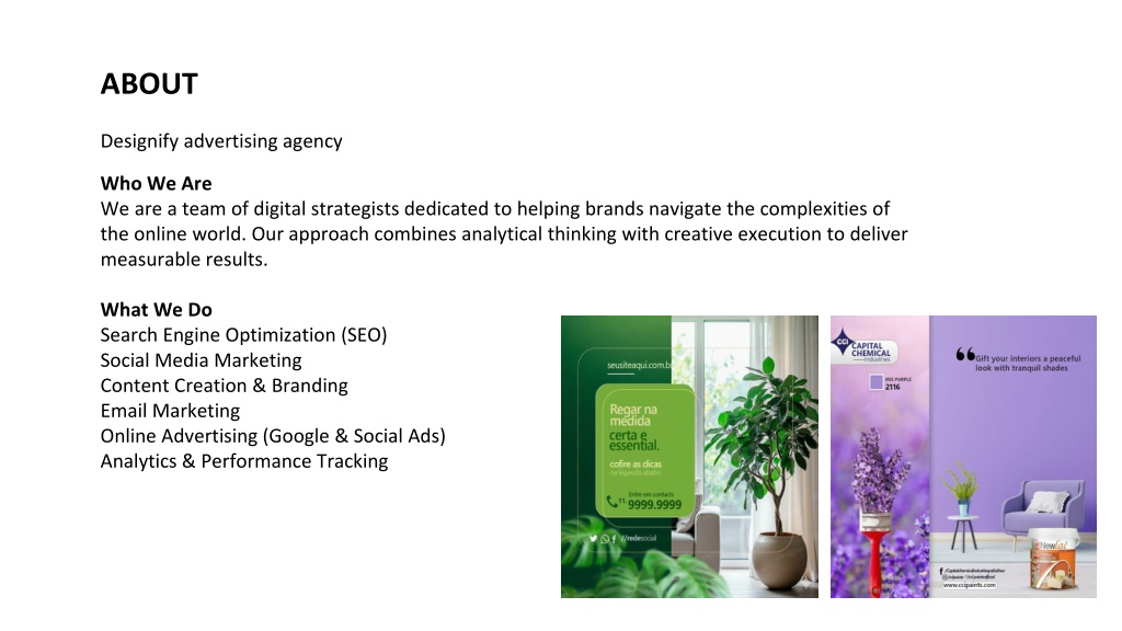 ABOUT Designify advertising agency Who We Are We are a team of digital strategists dedicated to helping brands navigate the complexities of the online world. Our approach combines analytical thinking with creative execution to deliver measurable results. What We Do Search Engine Optimization (SEO) Social Media Marketing Content Creation & Branding Email Marketing Online Advertising (Google & Social Ads) Analytics & Performance Tracking
