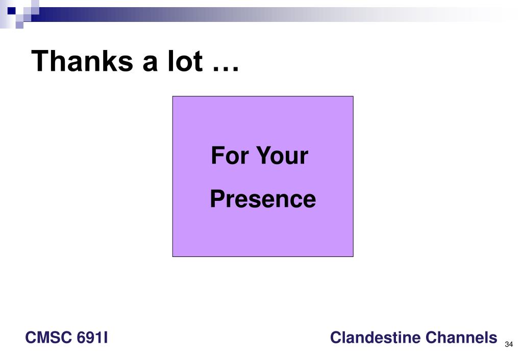 References • Hide and Seek: An Introduction to Steganography, Niels Provos, Peter Honeyman, IEEE Security and Privacy Journal, May-June 2003 • Embedding Covert Channels into TCP/IP, Steven J. Murdoch, Stephen Lewis, 7th Information Hiding Workshop, Barcelona, Catalonia (Spain) June 2005