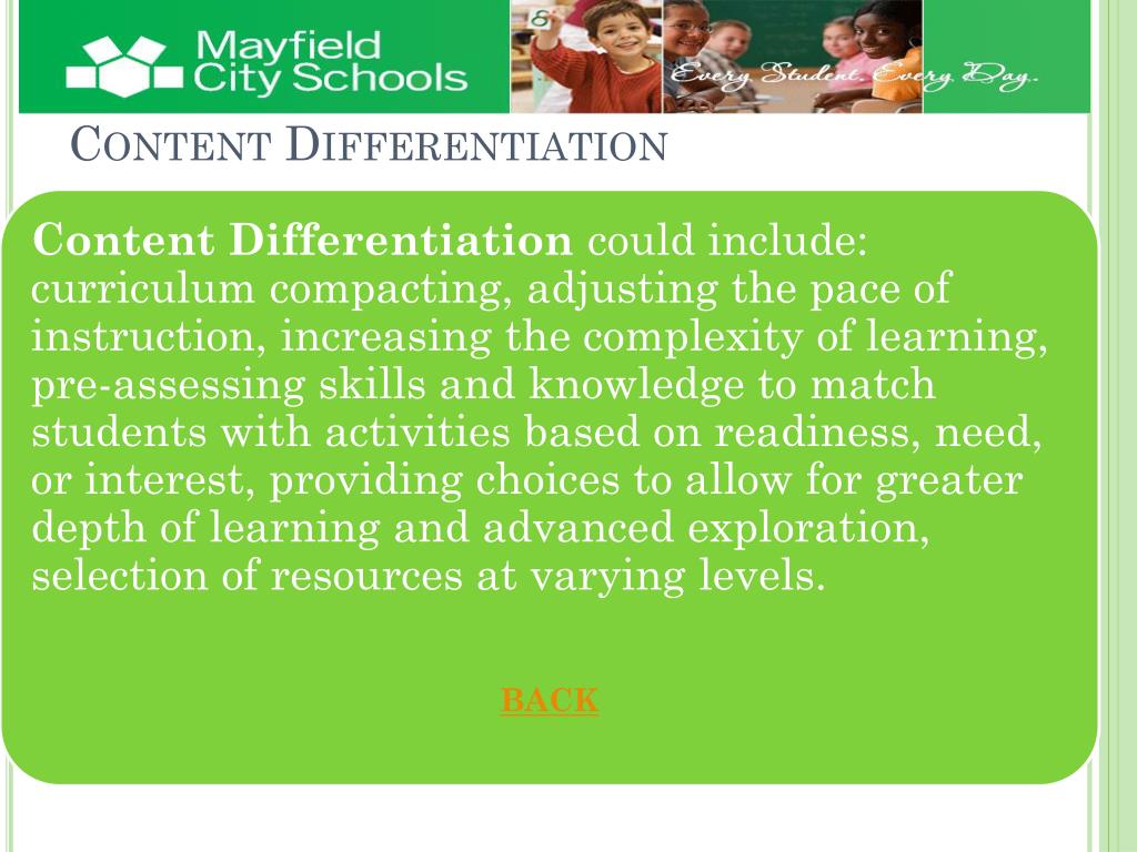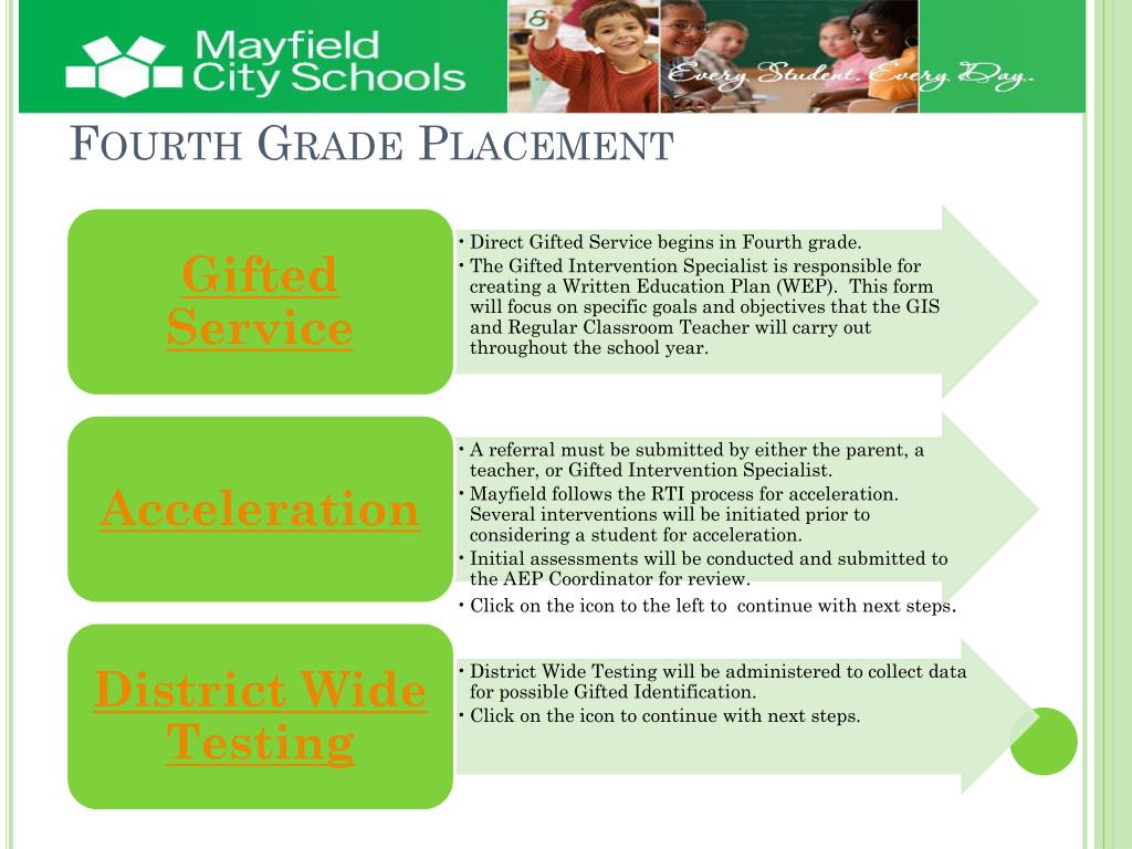 Discover the identification and placement process for gifted students in the Mayfield City School District. Our program provides a thorough initial screening and offers various placement options from Kindergarten through high school, including early entrance and acceleration processes. The referral team meets to assess testing outcomes and ensure students receive appropriate educational services. For more information on gifted services, differentiation strategies, and the appeal process, please contact Carrie Heath, AEP Coordinator, at 995-7486 or via email at cheath@mayfieldschools.org.