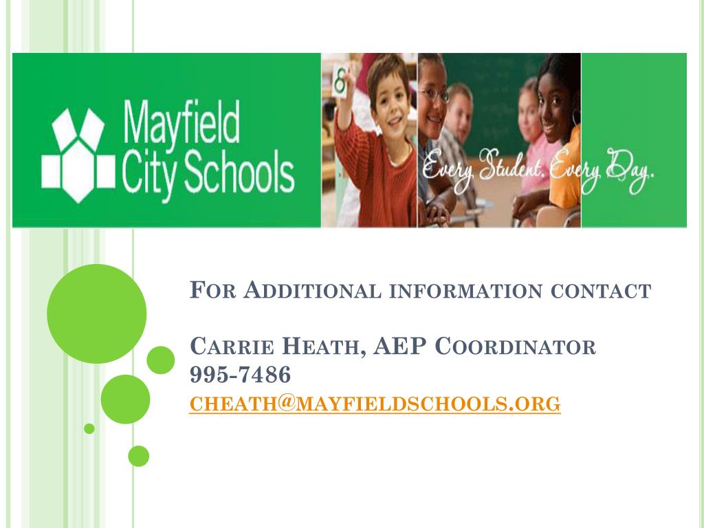 For Additional information contact Carrie Heath, AEP Coordinator 995-7486cheath@mayfieldschools.org