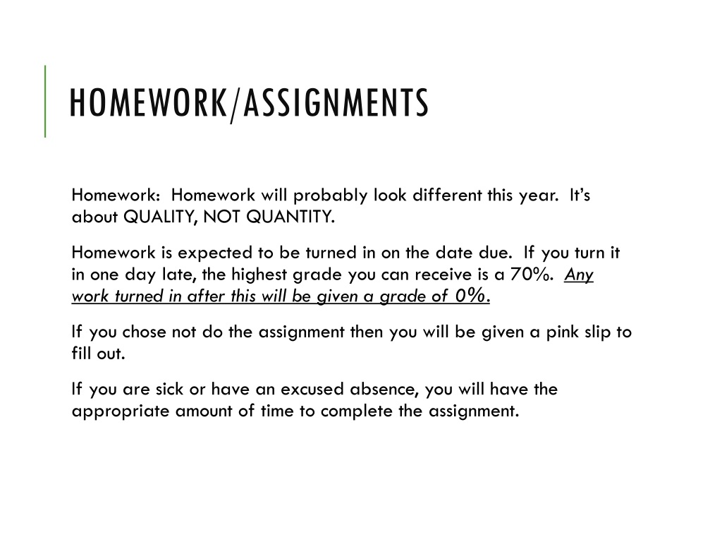 Homework/assignments • Homework: Homework will probably look different this year. It’s about QUALITY, NOT QUANTITY. • Homework is expected to be turned in on the date due. If you turn it in one day late, the highest grade you can receive is a 70%. Any work turned in after this will be given a grade of 0%. • If you chose not do the assignment then you will be given a pink slip to fill out. • If you are sick or have an excused absence, you will have the appropriate amount of time to complete the assignment.