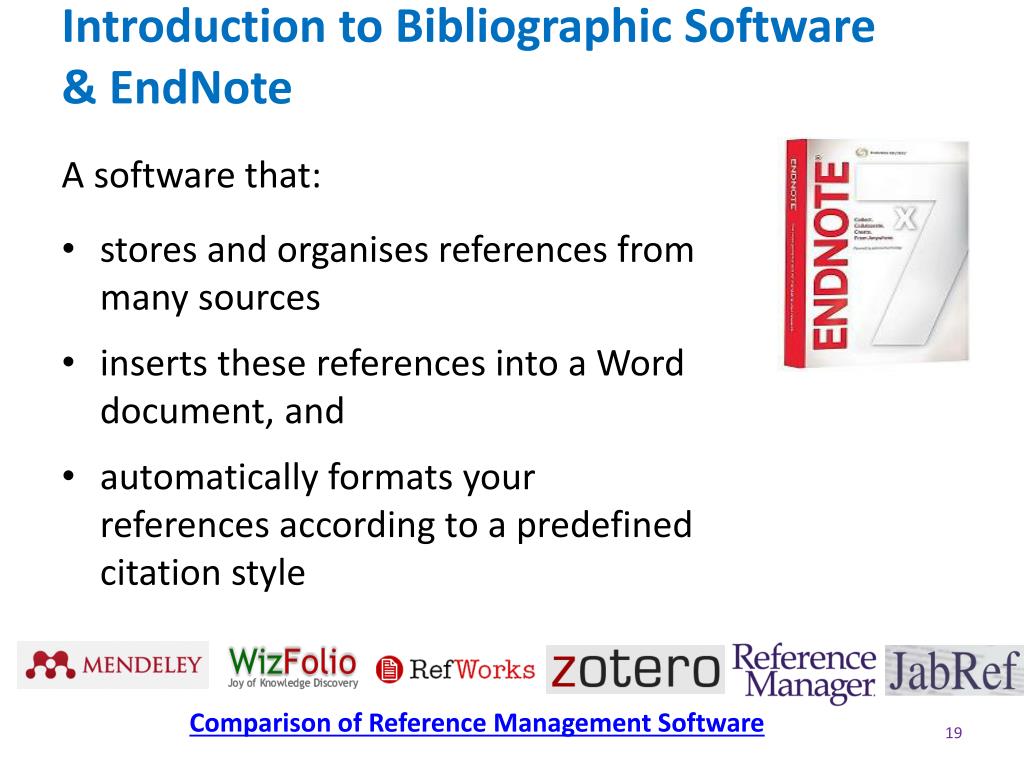Introduction to Bibliographic Software & EndNote • A software that: • stores and organises references from many sources • inserts these references into a Word document, and • automatically formats your references according to a predefined citation style Comparison of Reference Management Software