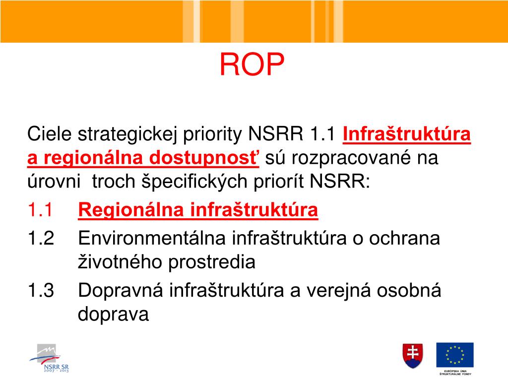 ROP Ciele strategickej priority NSRR 1.1 Infraštruktúra a regionálna dostupnosť sú rozpracované na úrovni troch špecifických priorít NSRR: 1.1 Regionálna infraštruktúra 1.2 Environmentálna infraštruktúra o ochrana životného prostredia 1.3 Dopravná infraštruktúra a verejná osobná doprava