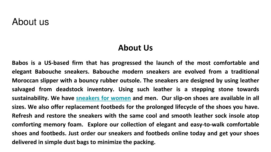 About us About Us Babos is a US-based firm that has progressed the launch of the most comfortable and elegant Babouche sneakers. Babouche modern sneakers are evolved from a traditional Moroccan slipper with a bouncy rubber outsole. The sneakers are designed by using leather salvaged from deadstock inventory. Using such leather is a stepping stone towards sustainability. We have sneakers for women and men. Our slip-on shoes are available in all sizes. We also offer replacement footbeds for the prolonged lifecycle of the shoes you have. Refresh and restore the sneakers with the same cool and smooth leather sock insole atop comforting memory foam. Explore our collection of elegant and easy-to-walk comfortable shoes and footbeds. Just order our sneakers and footbeds online today and get your shoes delivered in simple dust bags to minimize the packing.