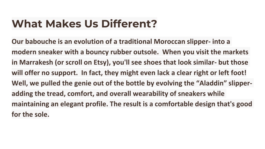 What Makes Us Different? Our babouche is an evolution of a traditional Moroccan slipper- into a modern sneaker with a bouncy rubber outsole. When you visit the markets in Marrakesh (or scroll on Etsy), you'll see shoes that look similar- but those will offer no support. In fact, they might even lack a clear right or left foot! Well, we pulled the genie out of the bottle by evolving the “Aladdin” slipper- adding the tread, comfort, and overall wearability of sneakers while maintaining an elegant profile. The result is a comfortable design that's good for the sole.