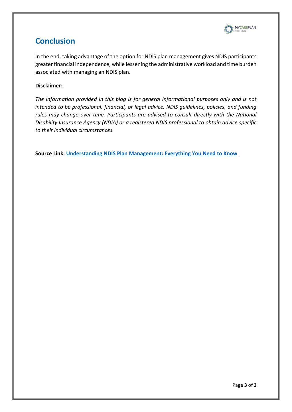 3. Conclusion In the end, taking advantage of the option for NDIS plan management gives NDIS participants greater financial independence, while lessening the administrative workload and time burden associated with managing an NDIS plan. Disclaimer: The information provided in this blog is for general informational purposes only and is not intended to be professional, financial, or legal advice. NDIS guidelines, policies, and funding rules may change over time. Participants are advised to consult directly with the National Disability Insurance Agency (NDIA) or a registered NDIS professional to obtain advice specific to their individual circumstances. Source Link: Understanding NDIS Plan Management: Everything You Need to Know Page 3 of 3