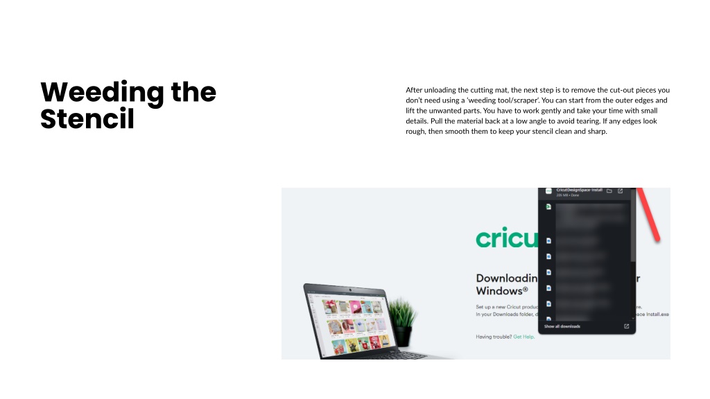 Weeding the Stencil After unloading the cutting mat, the next step is to remove the cut-out pieces you don’t need using a ‘weeding tool/scraper‘. You can start from the outer edges and lift the unwanted parts. You have to work gently and take your time with small details. Pull the material back at a low angle to avoid tearing. If any edges look rough, then smooth them to keep your stencil clean and sharp.