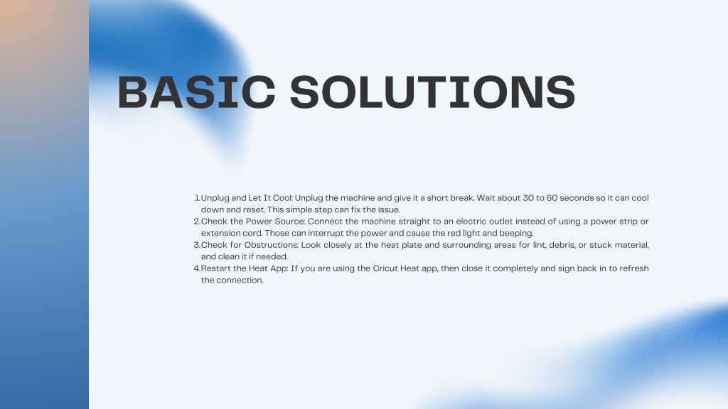 5. BASIC SOLUTIONS 1.Unplug and Let It Cool: Unplug the machine and give it a short break. Wait about 30 to 60 seconds so it can cool down and reset. This simple step can fix the issue. 2.Check the Power Source: Connect the machine straight to an electric outlet instead of using a power strip or extension cord. Those can interrupt the power and cause the red light and beeping. 3.Check for Obstructions: Look closely at the heat plate and surrounding areas for lint, debris, or stuck material, and clean it if needed. 4.Restart the Heat App: If you are using the Cricut Heat app, then close it completely and sign back in to refresh the connection.