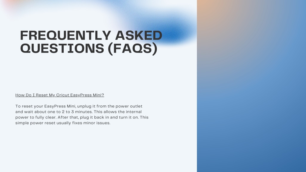 7. FREQUENTLY ASKED QUESTIONS (FAQS) How Do I Reset My Cricut EasyPress Mini? To reset your EasyPress Mini, unplug it from the power outlet and wait about one to 2 to 3 minutes. This allows the internal power to fully clear. After that, plug it back in and turn it on. This simple power reset usually fixes minor issues.