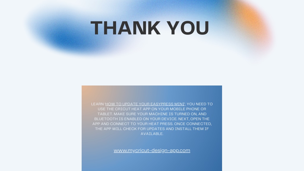 9. THANK YOU LEARN ‘HOW TO UPDATE YOUR EASYPRESS MINI‘, YOU NEED TO USE THE CRICUT HEAT APP ON YOUR MOBILE PHONE OR TABLET. MAKE SURE YOUR MACHINE IS TURNED ON, AND BLUETOOTH IS ENABLED ON YOUR DEVICE. NEXT, OPEN THE APP AND CONNECT TO YOUR HEAT PRESS. ONCE CONNECTED, THE APP WILL CHECK FOR UPDATES AND INSTALL THEM IF AVAILABLE. www.mycricut-design-app.com