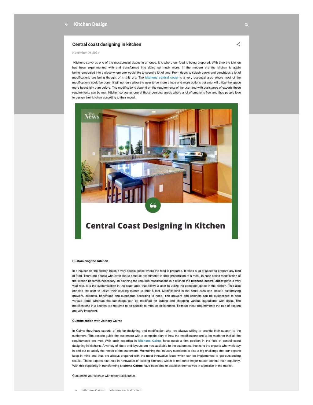 Kitchen Design Central coast designing in kitchen November 09, 2021 Kitchens serve as one of the most crucial places in a house. It is where our food is being prepared. With time the kitchen has been experimented with and transformed into doing so much more. In the modern era the kitchen is again being remodeled into a place where one would like to spend a lot of time. From doors to splash backs and benchtops a lot of modifications are being thought of in this era. The kitchens central coast is a very essential area where most of the modifications could be done. It will not only allow the user to do more things and more options but also will utilize the space more beautifully than before. The modifications depend on the requirements of the user and with assistance of experts these requirements can be met. Kitchen serves as one of those personal areas where a lot of emotions flow and thus people love to design their kitchen according to their mood. Customizing the Kitchen In a household the kitchen holds a very special place where the food is prepared. It takes a lot of space to prepare any kind of food. There are people who even like to conduct experiments in their preparation of a meal. In such cases modification of the kitchen becomes necessary. In planning the required modifications in a kitchen the kitchens central coast plays a very vital role. It is the customization in the coast area that allows a user to utilize the complete space in the kitchen. This also enables the user to utilize their cooking talents to their fullest. Modifications in the coast area can include customizing drawers, cabinets, benchtops and cupboards according to need. The drawers and cabinets can be customized to hold various items whereas the benchtops can be modified for cutting and chopping various ingredients with ease. The modifications in a kitchen are required to be specific to meet specific needs. To meet these requirements the role of experts are very important. Customization with Joinery Cairns In Cairns they have experts of interior designing and modification who are always willing to provide their support to the customers. The experts guide the customers with a complete plan of how the modifications are to be made so that all the requirements are met. With such expertise in kitchens Cairns have made a firm position in the field of central coast designing in kitchens. A variety of ideas and layouts are now available to the customers, thanks to the experts who work day in and out to satisfy the needs of the customers. Maintaining the industry standards is also a big challenge that our experts keep in mind and thus are always prepared with the most innovative ideas which can be implemented to get outstanding results. These experts also help in renovation of existing kitchens, which is one other major reason behind their popularity. With this popularity in transforming kitchens Cairns have been able to establish themselves in a position in the market. Customize your kitchen with expert assistance. kitchens Cairns kitchens central coast