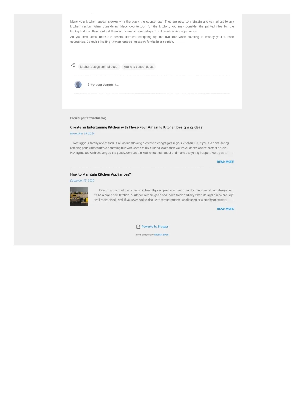 p Make your kitchen appear sleeker with the black tile countertops. They are easy to maintain and can adjust to any kitchen design. When considering black countertops for the kitchen, you may consider the printed tiles for the backsplash and then contrast them with ceramic countertops. It will create a nice appearance. As you have seen, there are several different designing options available when planning to modify your kitchen countertop. Consult a leading kitchen remodeling expert for the best opinion. kitchen design central coast kitchens central coast Enter your comment... Popular posts from this blog Create an Entertaining Kitchen with These Four Amazing Kitchen Designing Ideas November 19, 2020 Hosting your family and friends is all about allowing crowds to congregate in your kitchen. So, if you are considering refacing your kitchen into a charming hub with some really alluring looks then you have landed on the correct article. Having issues with decking up the pantry, contact the kitchen central coast and make everything happen. Here you will … READ MORE How to Maintain Kitchen Appliances? December 15, 2020 Several corners of a new home is loved by everyone in a house, but the most loved part always has to be a brand new kitchen. A kitchen remain good and looks fresh and airy when its appliances are kept well-maintained. And, if you ever had to deal with temperamental appliances or a cruddy apartment, you… READ MORE Powered by Blogger Theme images by Michael Elkan