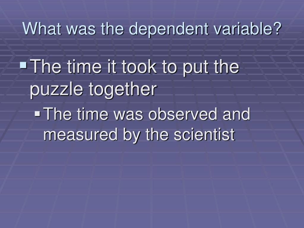 What was the dependent variable? • The time it took to put the puzzle together • The time was observed and measured by the scientist