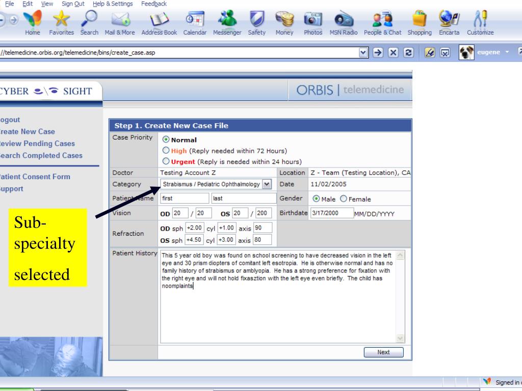Partner logs on to web site • Go to: www.orbis.org • Click on Cyber-Sight (left side of screen scroll down ¼ screen) • Click on Cyber-Sight again on right side of screen • Click on E-consultation • Add user name and password– these are assigned by ORBIS • This brings up the formatted page for patient information upload