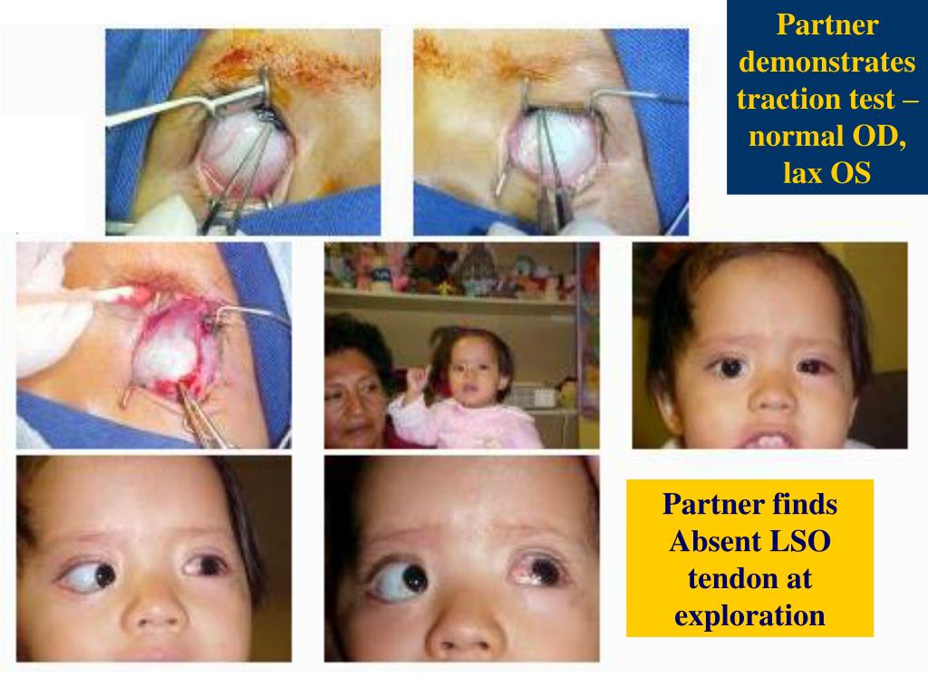 Partner demonstrates traction test – normal OD, lax OS Partner finds Absent LSO tendon at exploration