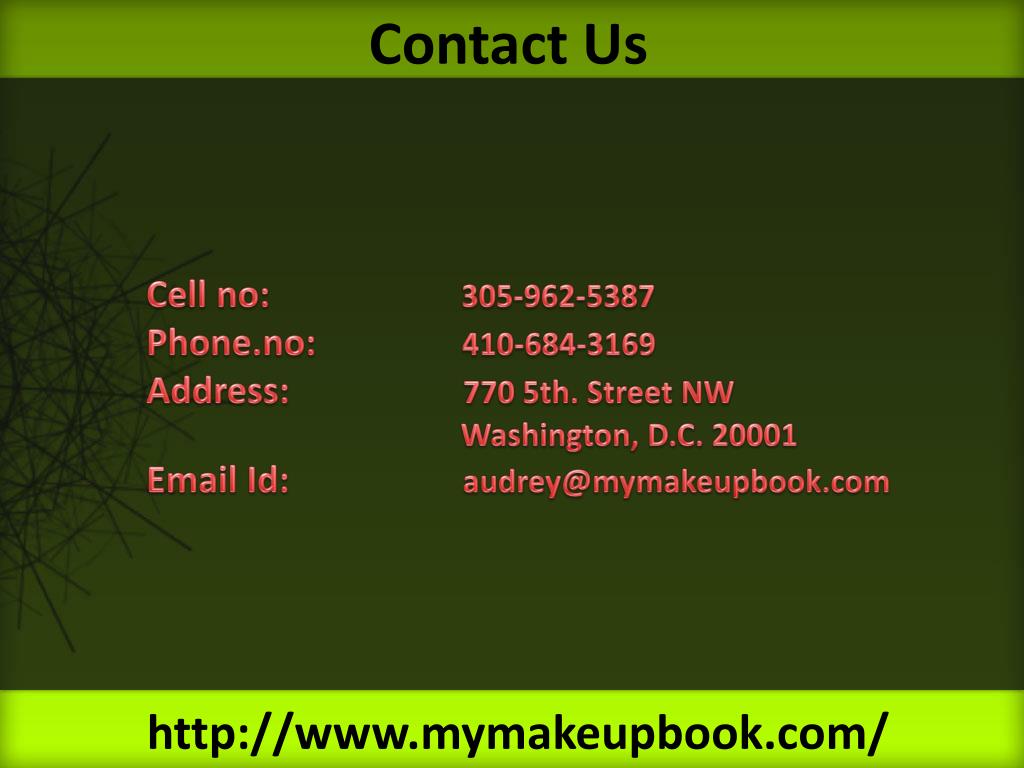 Contact Us Cell no: 305-962-5387 Phone.no: 410-684-3169 Address: 770 5th. Street NW Washington, D.C. 20001 Email Id: audrey@mymakeupbook.com http://www.mymakeupbook.com/