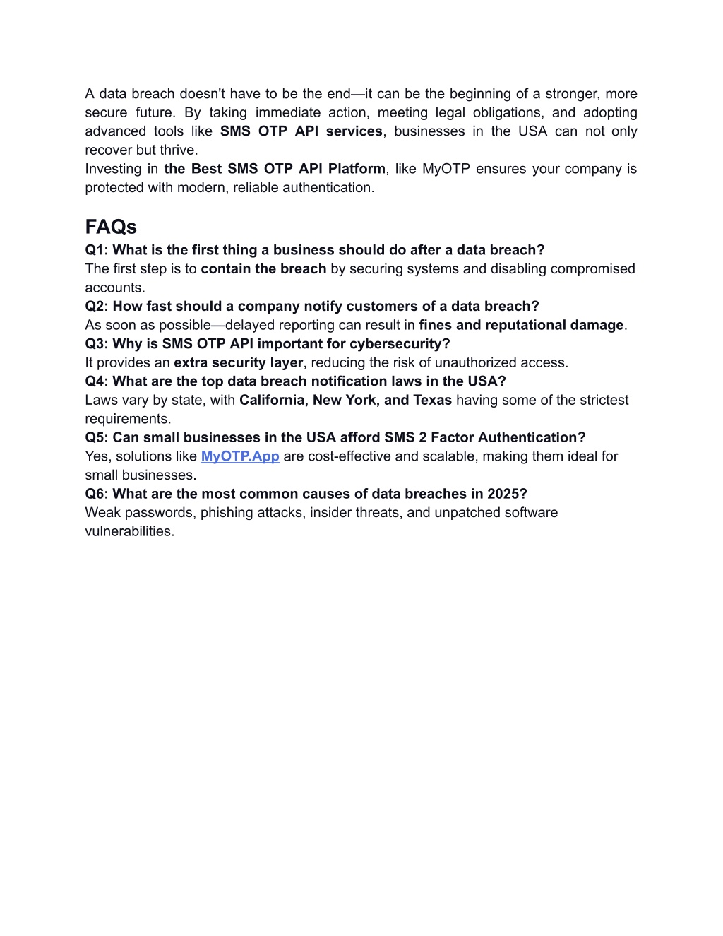 A data breach doesn't have to be the end—it can be the beginning of a stronger, more secure future. By taking immediate action, meeting legal obligations, and adopting advanced tools like SMS OTP API services, businesses in the USA can not only recover but thrive. Investing in the Best SMS OTP API Platform, like MyOTP ensures your company is protected with modern, reliable authentication. FAQs Q1: What is the first thing a business should do after a data breach? The first step is to contain the breach by securing systems and disabling compromised accounts. Q2: How fast should a company notify customers of a data breach? As soon as possible—delayed reporting can result in fines and reputational damage. Q3: Why is SMS OTP API important for cybersecurity? It provides an extra security layer, reducing the risk of unauthorized access. Q4: What are the top data breach notification laws in the USA? Laws vary by state, with California, New York, and Texas having some of the strictest requirements. Q5: Can small businesses in the USA afford SMS 2 Factor Authentication? Yes, solutions like MyOTP.App are cost-effective and scalable, making them ideal for small businesses. Q6: What are the most common causes of data breaches in 2025? Weak passwords, phishing attacks, insider threats, and unpatched software vulnerabilities.