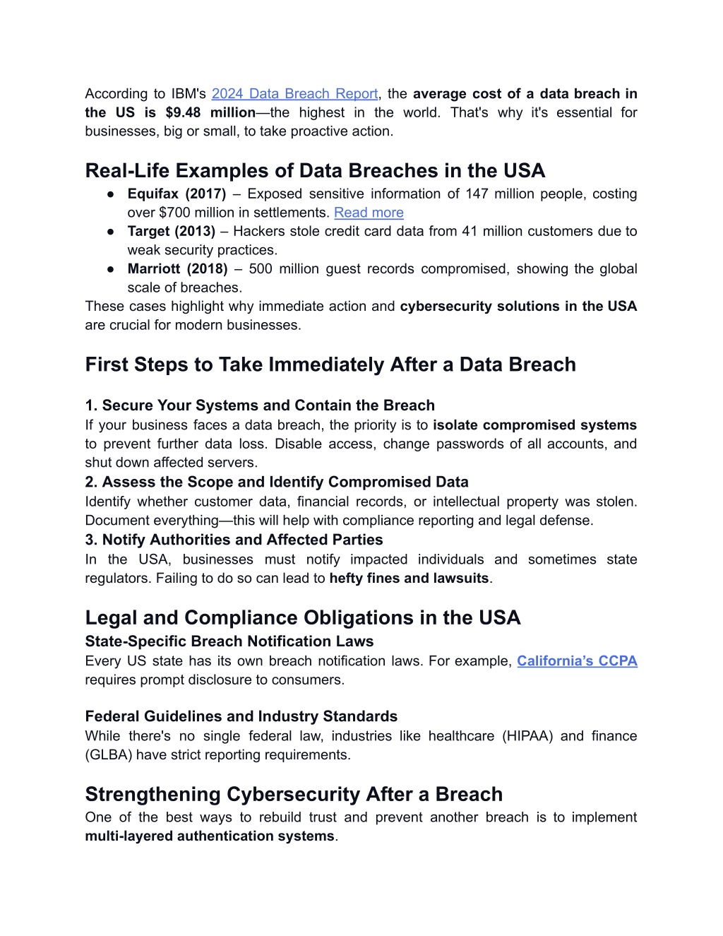 According to IBM's 2024 Data Breach Report, the average cost of a data breach in the US is $9.48 million—the highest in the world. That's why it's essential for businesses, big or small, to take proactive action. Real-Life Examples of Data Breaches in the USA ● Equifax (2017) – Exposed sensitive information of 147 million people, costing over $700 million in settlements. Read more ● Target (2013) – Hackers stole credit card data from 41 million customers due to weak security practices. ● Marriott (2018) – 500 million guest records compromised, showing the global scale of breaches. These cases highlight why immediate action and cybersecurity solutions in the USA are crucial for modern businesses. First Steps to Take Immediately After a Data Breach 1. Secure Your Systems and Contain the Breach If your business faces a data breach, the priority is to isolate compromised systems to prevent further data loss. Disable access, change passwords of all accounts, and shut down affected servers. 2. Assess the Scope and Identify Compromised Data Identify whether customer data, financial records, or intellectual property was stolen. Document everything—this will help with compliance reporting and legal defense. 3. Notify Authorities and Affected Parties In the USA, businesses must notify impacted individuals and sometimes state regulators. Failing to do so can lead to hefty fines and lawsuits. Legal and Compliance Obligations in the USA State-Specific Breach Notification Laws Every US state has its own breach notification laws. For example, California’s CCPA requires prompt disclosure to consumers. Federal Guidelines and Industry Standards While there's no single federal law, industries like healthcare (HIPAA) and finance (GLBA) have strict reporting requirements. Strengthening Cybersecurity After a Breach One of the best ways to rebuild trust and prevent another breach is to implement multi-layered authentication systems.