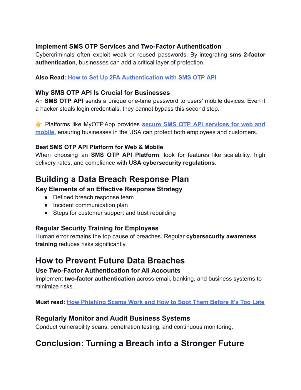 Implement SMS OTP Services and Two-Factor Authentication Cybercriminals often exploit weak or reused passwords. By integrating sms 2-factor authentication, businesses can add a critical layer of protection. Also Read: How to Set Up 2FA Authentication with SMS OTP API Why SMS OTP API Is Crucial for Businesses An SMS OTP API sends a unique one-time password to users' mobile devices. Even if a hacker steals login credentials, they cannot bypass this second step. ? Platforms like MyOTP.App provides secure SMS OTP API services for web and mobile, ensuring businesses in the USA can protect both employees and customers. Best SMS OTP API Platform for Web & Mobile When choosing an SMS OTP API Platform, look for features like scalability, high delivery rates, and compliance with USA cybersecurity regulations. Building a Data Breach Response Plan Key Elements of an Effective Response Strategy ● Defined breach response team ● Incident communication plan ● Steps for customer support and trust rebuilding Regular Security Training for Employees Human error remains the top cause of breaches. Regular cybersecurity awareness training reduces risks significantly. How to Prevent Future Data Breaches Use Two-Factor Authentication for All Accounts Implement two-factor authentication across email, banking, and business systems to minimize risks. Must read: How Phishing Scams Work and How to Spot Them Before It's Too Late Regularly Monitor and Audit Business Systems Conduct vulnerability scans, penetration testing, and continuous monitoring. Conclusion: Turning a Breach into a Stronger Future