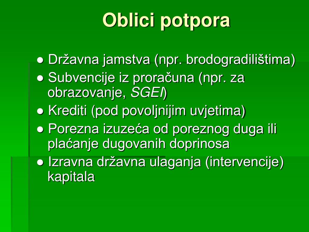 Oblici potpora ● Državna jamstva (npr. brodogradilištima) ● Subvencije iz proračuna (npr. za obrazovanje, SGEI) ● Krediti (pod povoljnijim uvjetima) ● Porezna izuzeća od poreznog duga ili plaćanje dugovanih doprinosa ● Izravna državna ulaganja (intervencije) kapitala