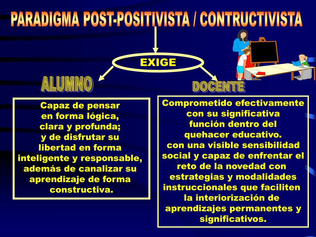 PARADIGMA POST-POSITIVISTA / CONTRUCTIVISTA EXIGE ALUMNO DOCENTE Comprometido efectivamente con su significativa función dentro del quehacer educativo. con una visible sensibilidad social y capaz de enfrentar el reto de la novedad con estrategias y modalidades instruccionales que faciliten la interiorización de aprendizajes permanentes y significativos. Capaz de pensar en forma lógica, clara y profunda; y de disfrutar su libertad en forma inteligente y responsable, además de canalizar su aprendizaje de forma constructiva.
