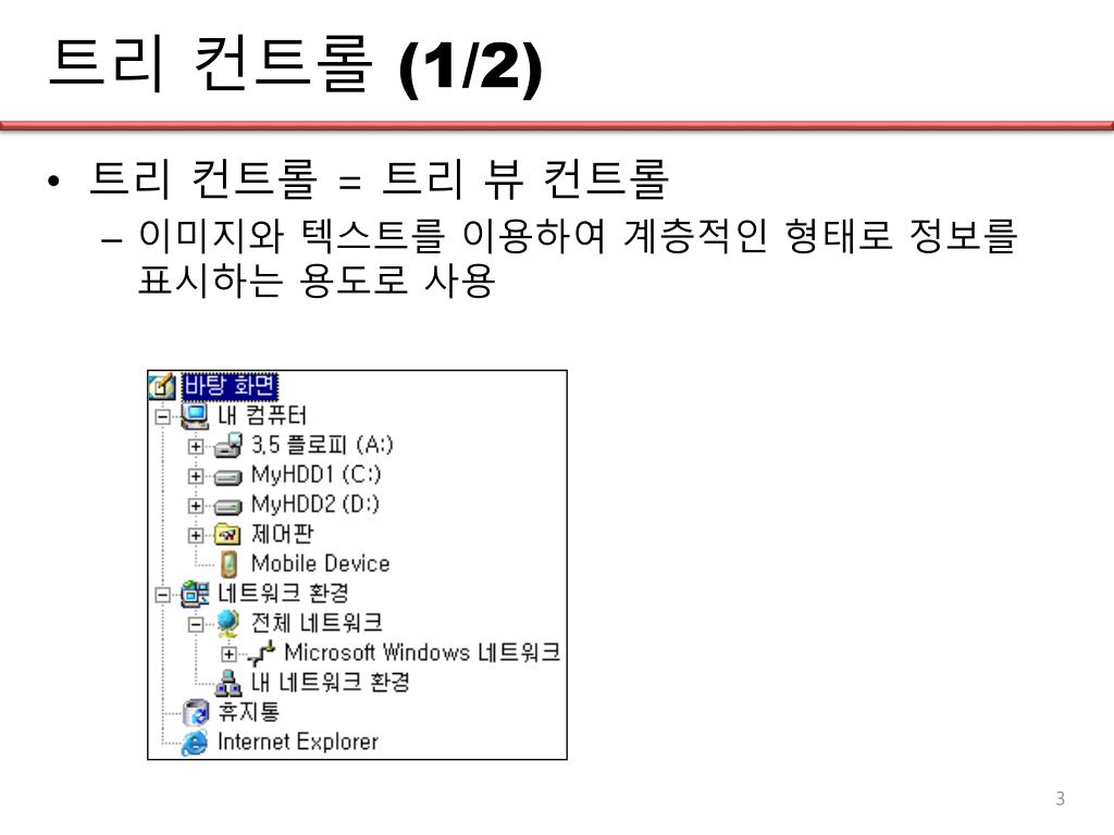 트리 컨트롤 (1/2) • 트리 컨트롤 = 트리 뷰 컨트롤 • 이미지와 텍스트를 이용하여 계층적인 형태로 정보를 표시하는 용도로 사용