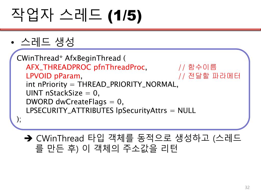 작업자 스레드 (4/5) • 스레드 종료 • 방법 1: 스레드 제어 함수가 리턴. 리턴값이 0이면 일반적으로 정상 종료를 뜻함 • 방법 2: 스레드 제어 함수 내에서 AfxEndThread() 호출