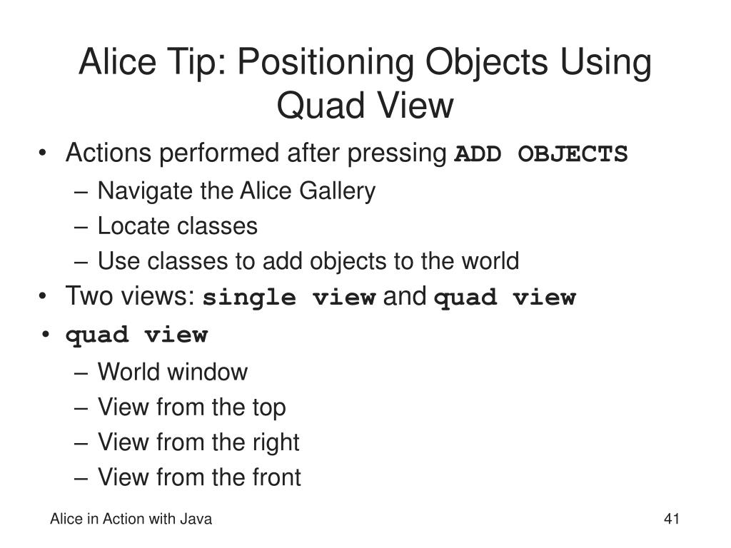 Alice Tip: Positioning Objects Using Quad View • Actions performed after pressing ADD OBJECTS • Navigate the Alice Gallery • Locate classes • Use classes to add objects to the world • Two views: single viewandquad view • quad view • World window • View from the top • View from the right • View from the front Alice in Action with Java