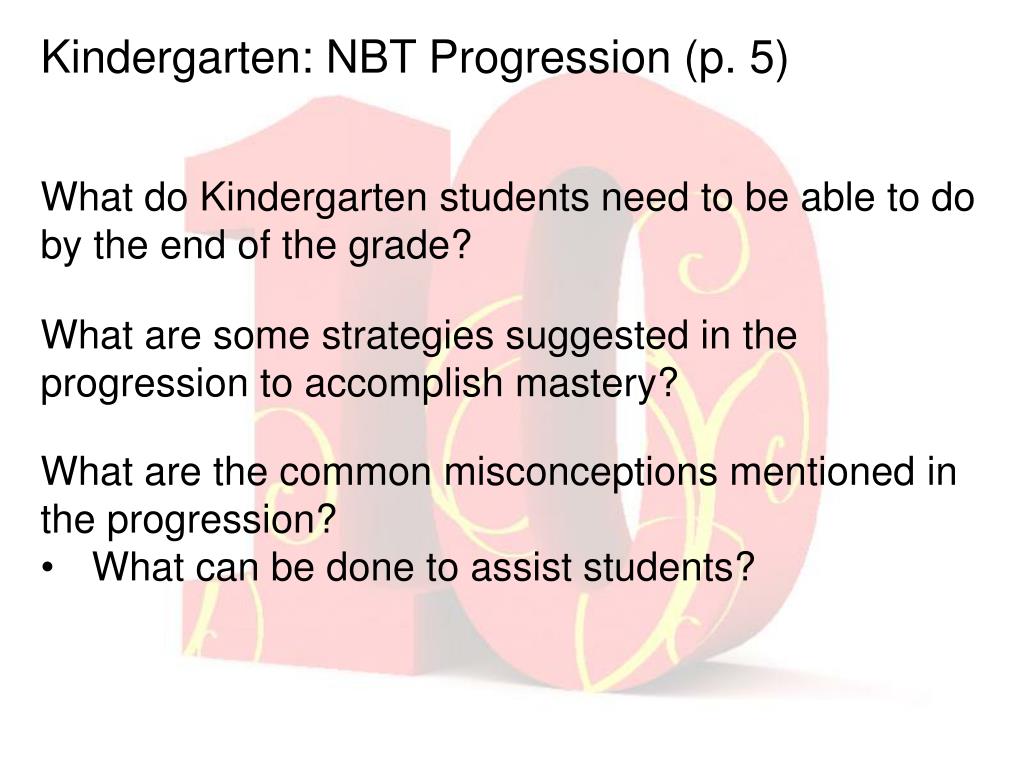 Kindergarten: NBT Progression (p. 5) What do Kindergarten students need to be able to do by the end of the grade? What are some strategies suggested in the progression to accomplish mastery? • What are the common misconceptions mentioned in the progression? • What can be done to assist students?