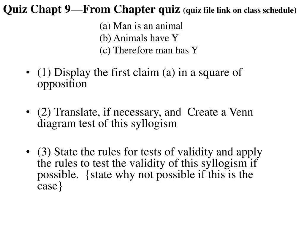 (a) Man is an animal (b) Animals have Y (c) Therefore man has Y Quiz Chapt 9—From Chapter quiz (quiz file link on class schedule) • (1) Display the first claim (a) in a square of opposition • (2) Translate, if necessary, and Create a Venn diagram test of this syllogism • (3) State the rules for tests of validity and apply the rules to test the validity of this syllogism if possible. {state why not possible if this is the case}