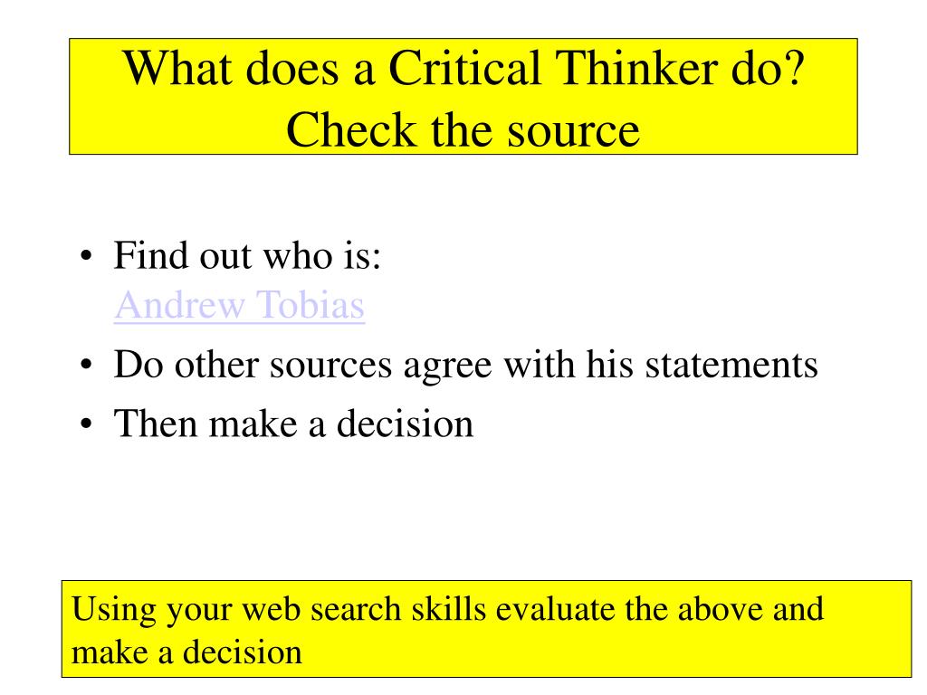 What does a Critical Thinker do?Check the source • Find out who is: Andrew Tobias • Do other sources agree with his statements • Then make a decision Using your web search skills evaluate the above and make a decision