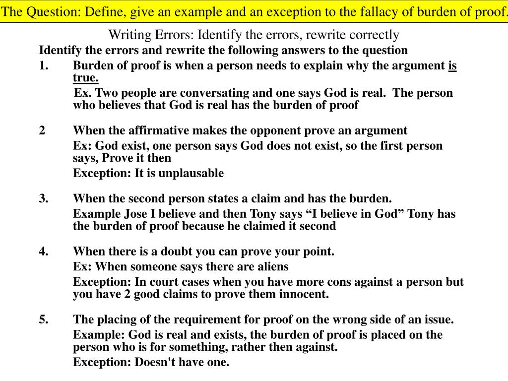 The Question: Define, give an example and an exception to the fallacy of burden of proof. Writing Errors: Identify the errors, rewrite correctly Identify the errors and rewrite the following answers to the question • Burden of proof is when a person needs to explain why the argument is true. Ex. Two people are conversating and one says God is real. The person who believes that God is real has the burden of proof • When the affirmative makes the opponent prove an argument Ex: God exist, one person says God does not exist, so the first person says, Prove it then Exception: It is unplausable • When the second person states a claim and has the burden. Example Jose I believe and then Tony says “I believe in God” Tony has the burden of proof because he claimed it second • When there is a doubt you can prove your point. Ex: When someone says there are aliens Exception: In court cases when you have more cons against a person but you have 2 good claims to prove them innocent. • The placing of the requirement for proof on the wrong side of an issue. Example: God is real and exists, the burden of proof is placed on the person who is for something, rather then against. Exception: Doesn't have one.