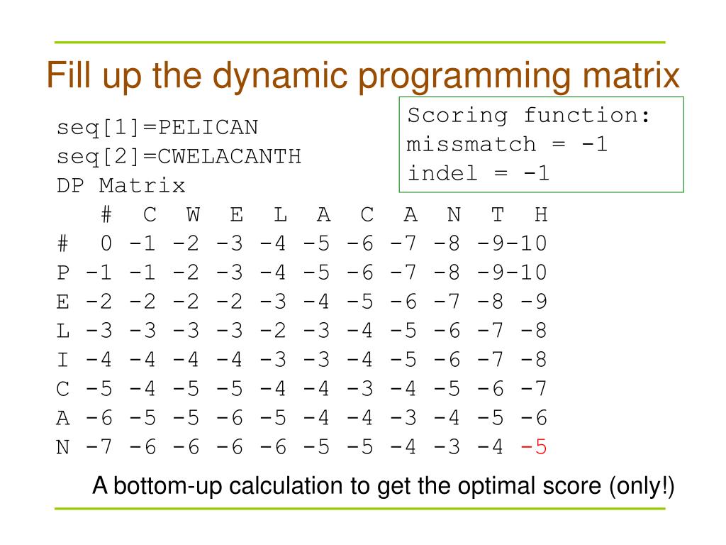 Fill up the dynamic programming matrix Scoring function: missmatch = -1 indel = -1 seq[1]=PELICAN seq[2]=CWELACANTH DP Matrix # C W E L A C A N T H # 0 -1 -2 -3 -4 -5 -6 -7 -8 -9-10 P -1 -1 -2 -3 -4 -5 -6 -7 -8 -9-10 E -2 -2 -2 -2 -3 -4 -5 -6 -7 -8 -9 L -3 -3 -3 -3 -2 -3 -4 -5 -6 -7 -8 I -4 -4 -4 -4 -3 -3 -4 -5 -6 -7 -8 C -5 -4 -5 -5 -4 -4 -3 -4 -5 -6 -7 A -6 -5 -5 -6 -5 -4 -4 -3 -4 -5 -6 N -7 -6 -6 -6 -6 -5 -5 -4 -3 -4 -5 A bottom-up calculation to get the optimal score (only!)