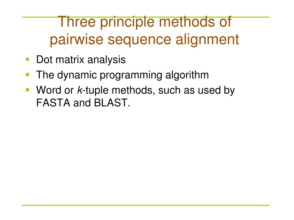 Three principle methods of pairwise sequence alignment • Dot matrix analysis • The dynamic programming algorithm • Word or k-tuple methods, such as used by FASTA and BLAST.
