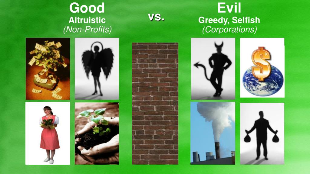 Evil Greedy, Selfish (Corporations) Good Altruistic (Non-Profits) vs.