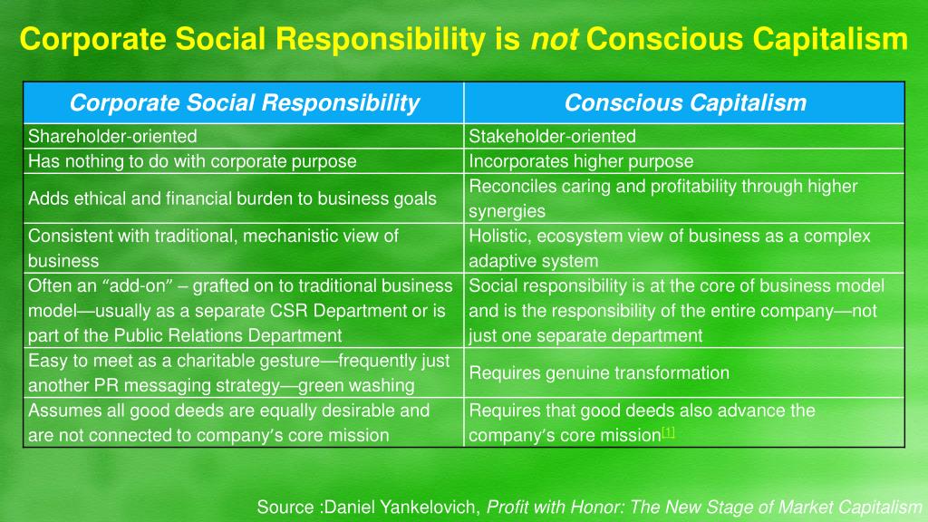 Corporate Social Responsibility is not Conscious Capitalism Source :Daniel Yankelovich, Profit with Honor: The New Stage of Market Capitalism