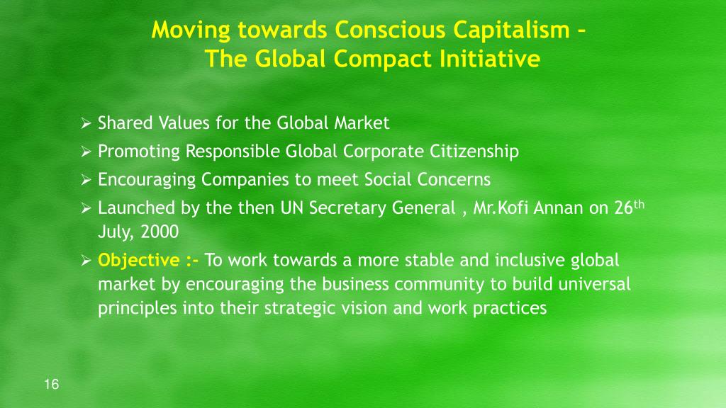 Moving towards Conscious Capitalism – The Global Compact Initiative • Shared Values for the Global Market • Promoting Responsible Global Corporate Citizenship • Encouraging Companies to meet Social Concerns • Launched by the then UN Secretary General , Mr.Kofi Annan on 26th July, 2000 • Objective :- To work towards a more stable and inclusive global market by encouraging the business community to build universal principles into their strategic vision and work practices