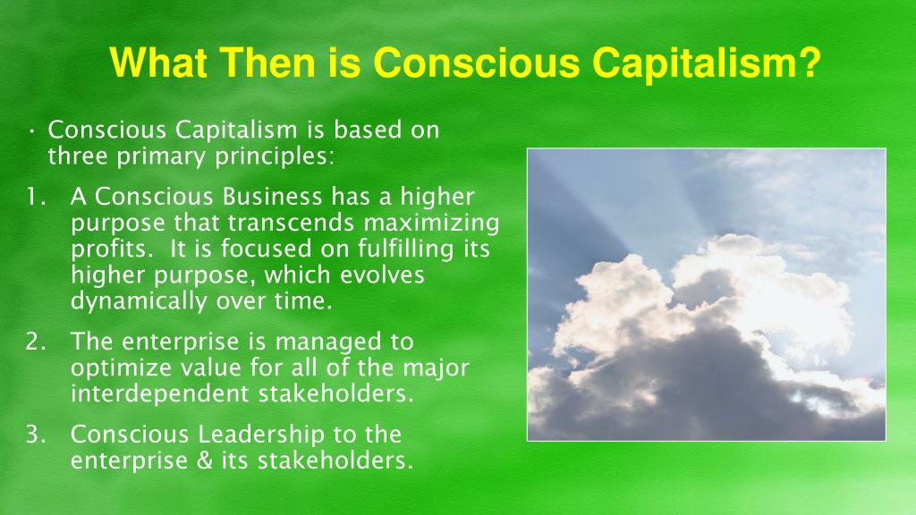 What Then is Conscious Capitalism? • Conscious Capitalism is based on three primary principles: • A Conscious Business has a higher purpose that transcends maximizing profits. It is focused on fulfilling its higher purpose, which evolves dynamically over time. • The enterprise is managed to optimize value for all of the major interdependent stakeholders. • Conscious Leadership to the enterprise & its stakeholders.
