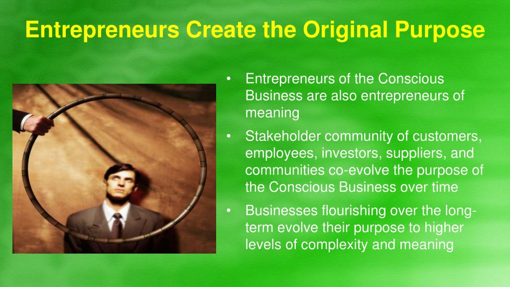 Entrepreneurs Create the Original Purpose • Entrepreneurs of the Conscious Business are also entrepreneurs of meaning • Stakeholder community of customers, employees, investors, suppliers, and communities co-evolve the purpose of the Conscious Business over time • Businesses flourishing over the long-term evolve their purpose to higher levels of complexity and meaning