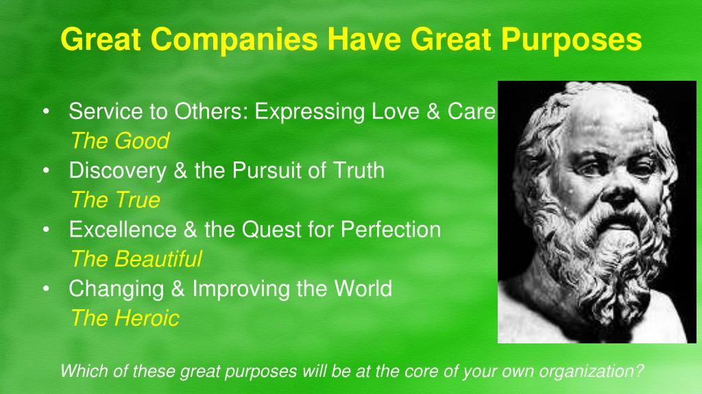 Great Companies Have Great Purposes • Service to Others: Expressing Love & Care The Good • Discovery & the Pursuit of Truth The True • Excellence & the Quest for Perfection The Beautiful • Changing & Improving the World The Heroic Which of these great purposes will be at the core of your own organization?