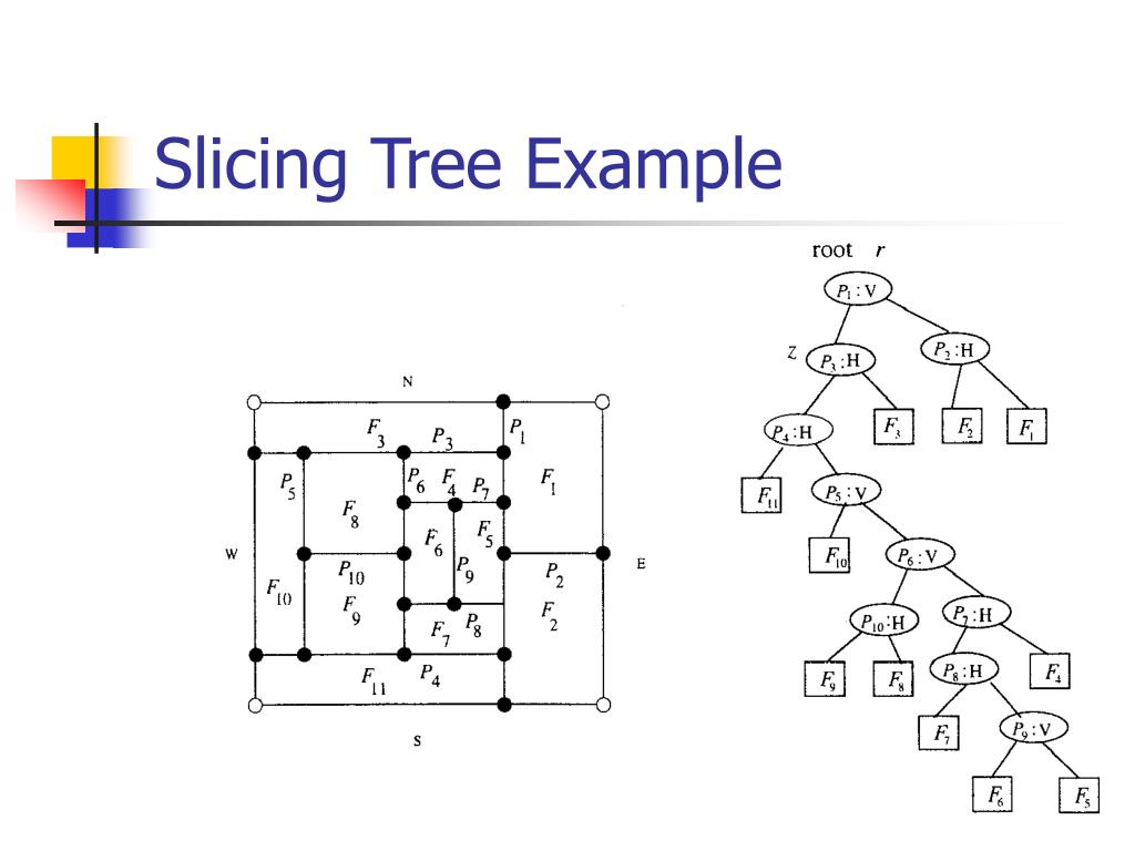 Slicing Tree We can make a tree using the recursive definition of a slicing graph • Leaf: face of the graph • Internal node: slicing path • V-Node: Vertical (N-S) slicing path • H-Node: Horizontal (W-E) slicing path