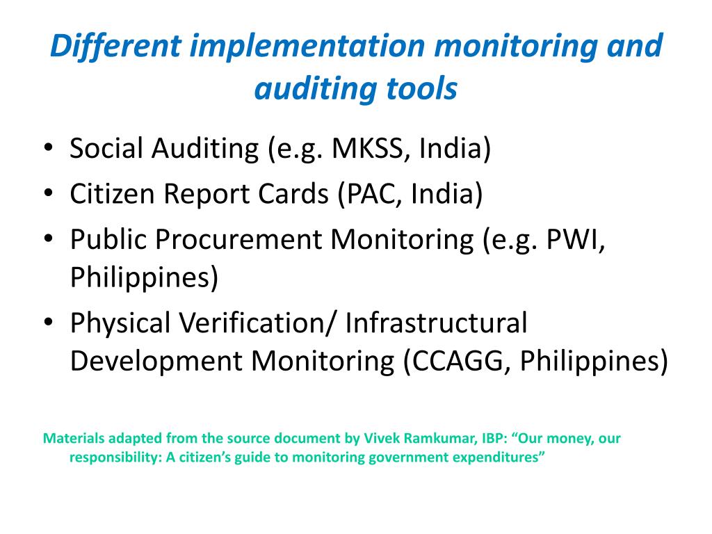 Different implementation monitoring and auditing tools • Social Auditing (e.g. MKSS, India) • Citizen Report Cards (PAC, India) • Public Procurement Monitoring (e.g. PWI, Philippines) • Physical Verification/ Infrastructural Development Monitoring (CCAGG, Philippines) Materials adapted from the source document by Vivek Ramkumar, IBP: “Our money, our responsibility: A citizen’s guide to monitoring government expenditures”