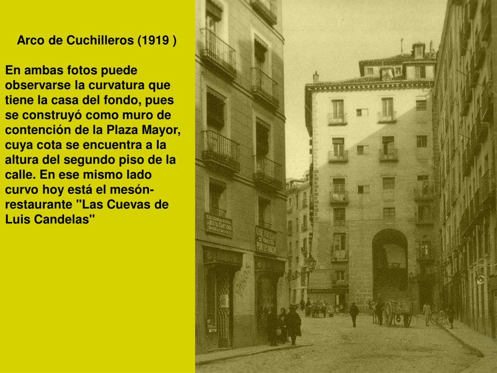Arco de Cuchilleros (1919 ) En ambas fotos puede observarse la curvatura que tiene la casa del fondo, pues se construyó como muro de contención de la Plaza Mayor, cuya cota se encuentra a la altura del segundo piso de la calle. En ese mismo lado curvo hoy está el mesón-restaurante "Las Cuevas de Luis Candelas"