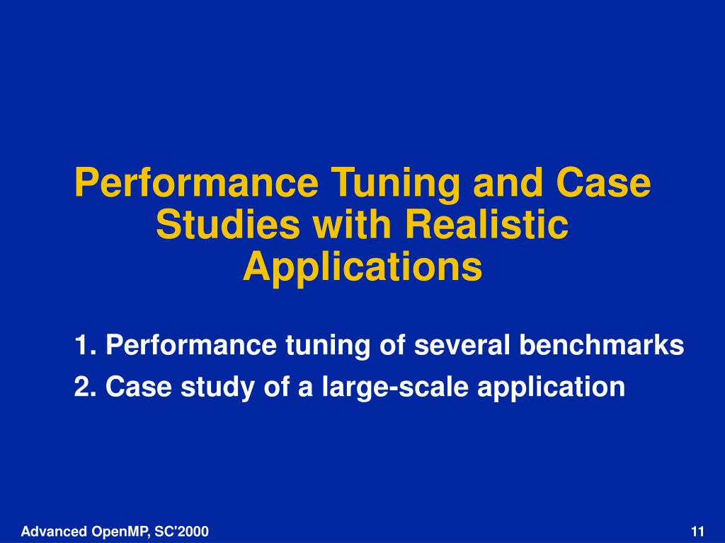 Performance Tuning and Case Studies with Realistic Applications 1. Performance tuning of several benchmarks 2. Case study of a large-scale application Advanced OpenMP, SC'2000