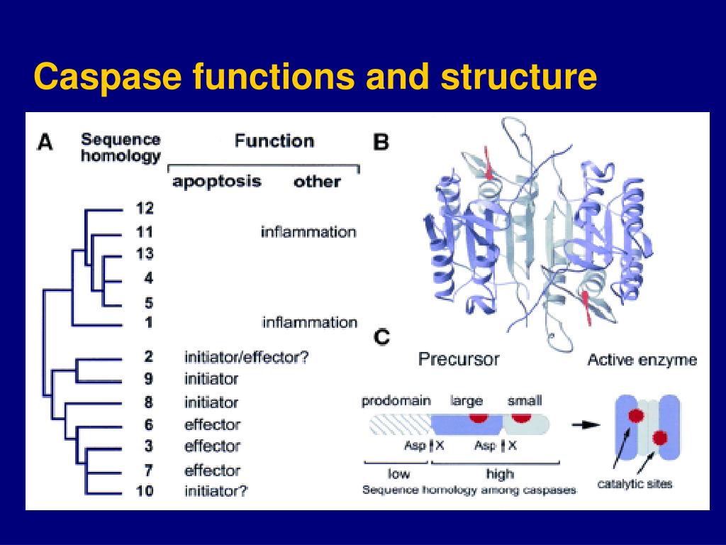 Caspases: cysteine-containing aspartate-specific proteases • Most apoptotic proteolytic cleavage results from the action of caspases • Caspases are activated by proteolytic cleavage • Removal of prodomain and linker region • Assembly of the large and small subunits into an active enzyme complex • Two heterodimers interacting via the small subunits to form a tetramer with two catalytic sites • Family members>14