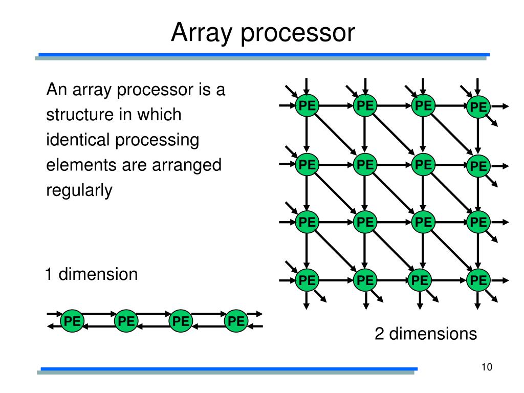 PE PE PE PE PE PE PE PE PE PE PE PE PE PE PE PE PE PE PE PE Array processor An array processor is a structure in which identical processing elements are arranged regularly 1 dimension 2 dimensions
