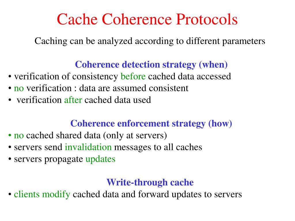 Cache Coherence Protocols • Caching can be analyzed according to different parameters • Coherence detection strategy (when) • verification of consistency before cached data accessed • no verification : data are assumed consistent • verification after cached data used • Coherence enforcement strategy (how) • no cached shared data (only at servers) • servers send invalidation messages to all caches • servers propagate updates • Write-through cache • clients modify cached data and forward updates to servers