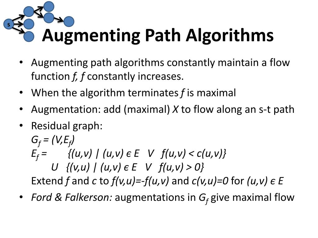 Augmenting Path Algorithms • Augmenting path algorithms constantly maintain a flow function f, fconstantly increases. • When the algorithm terminates f is maximal • Augmentation: add (maximal) Xto flow along an s-t path • Residual graph: Gf = (V,Ef)Ef = {(u,v) | (u,v) є E V f(u,v) < c(u,v)} U {(v,u) | (u,v) є E V f(u,v) > 0}Extend f and c to f(v,u)=-f(u,v) and c(v,u)=0 for (u,v)є E • Ford & Falkerson: augmentations in Gf give maximal flow s