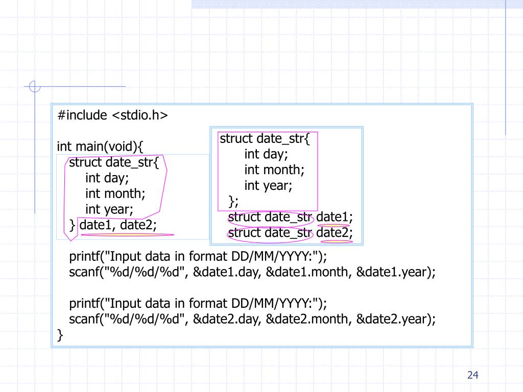 #include <stdio.h> int main(void){ struct date_str{ int day; int month; int year; } date1, date2; printf("Input data in format DD/MM/YYYY:"); scanf("%d/%d/%d", &date1.day, &date1.month, &date1.year); printf("Input data in format DD/MM/YYYY:"); scanf("%d/%d/%d", &date2.day, &date2.month, &date2.year); } struct date_str{ int day; int month; int year; }; struct date_str date1; struct date_str date2;